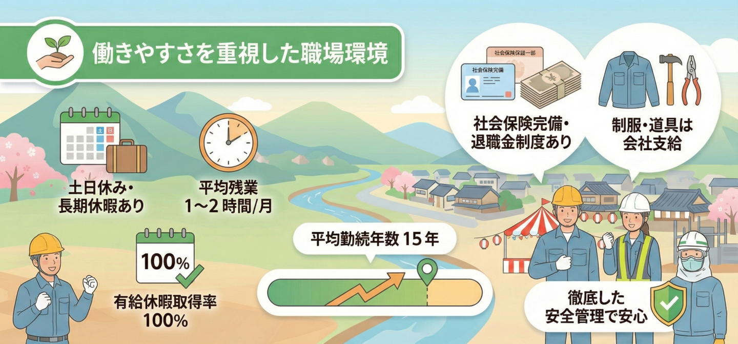 地域に根ざす専門企業として、社員の成長と安心を支える体制を整え、未来の街づくりをともに担う仲間を求めています。
