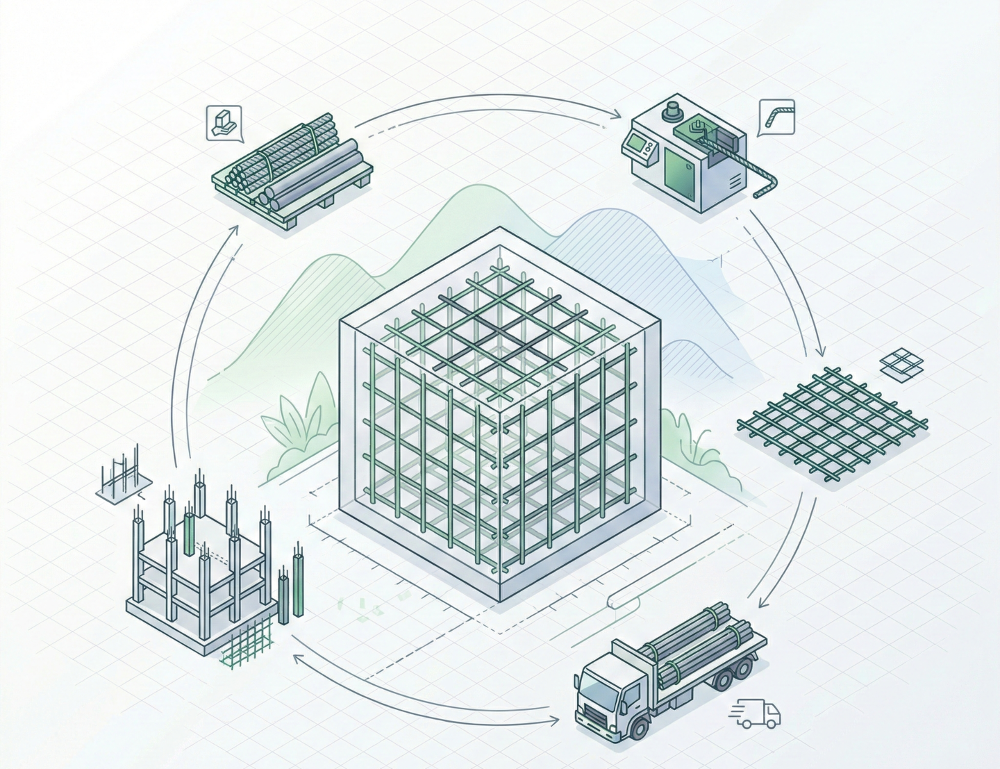 昭和56年の設立以来、鉄筋の販売・加工・組立・運搬を一貫して行う体制を整え、公共施設や民間建築、土木構造物など幅広い施工実績を積み重ねています。