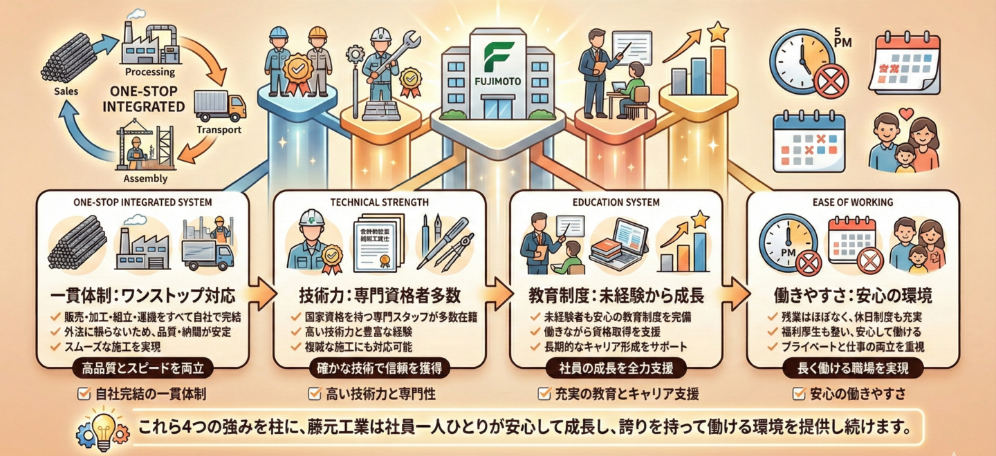 藤元工業は、鉄筋工事のプロフェッショナルとして、品質・技術・人材育成・働きやすさのすべてにこだわっています。