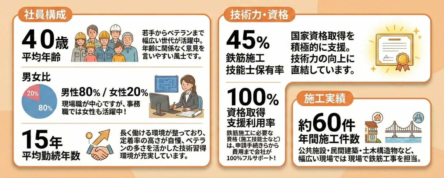 藤元工業は、鉄筋工事のプロフェッショナルとして、確かな実績と働きやすさを両立。昭和56年創業、徳島県全域で年間約60件の施工を手掛け、平均勤続年数15年、有給取得率100%、残業ほぼなし。安定した環境で長く活躍できる職場です。