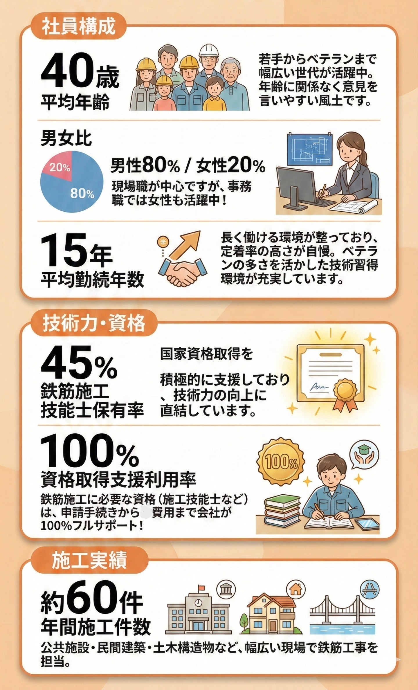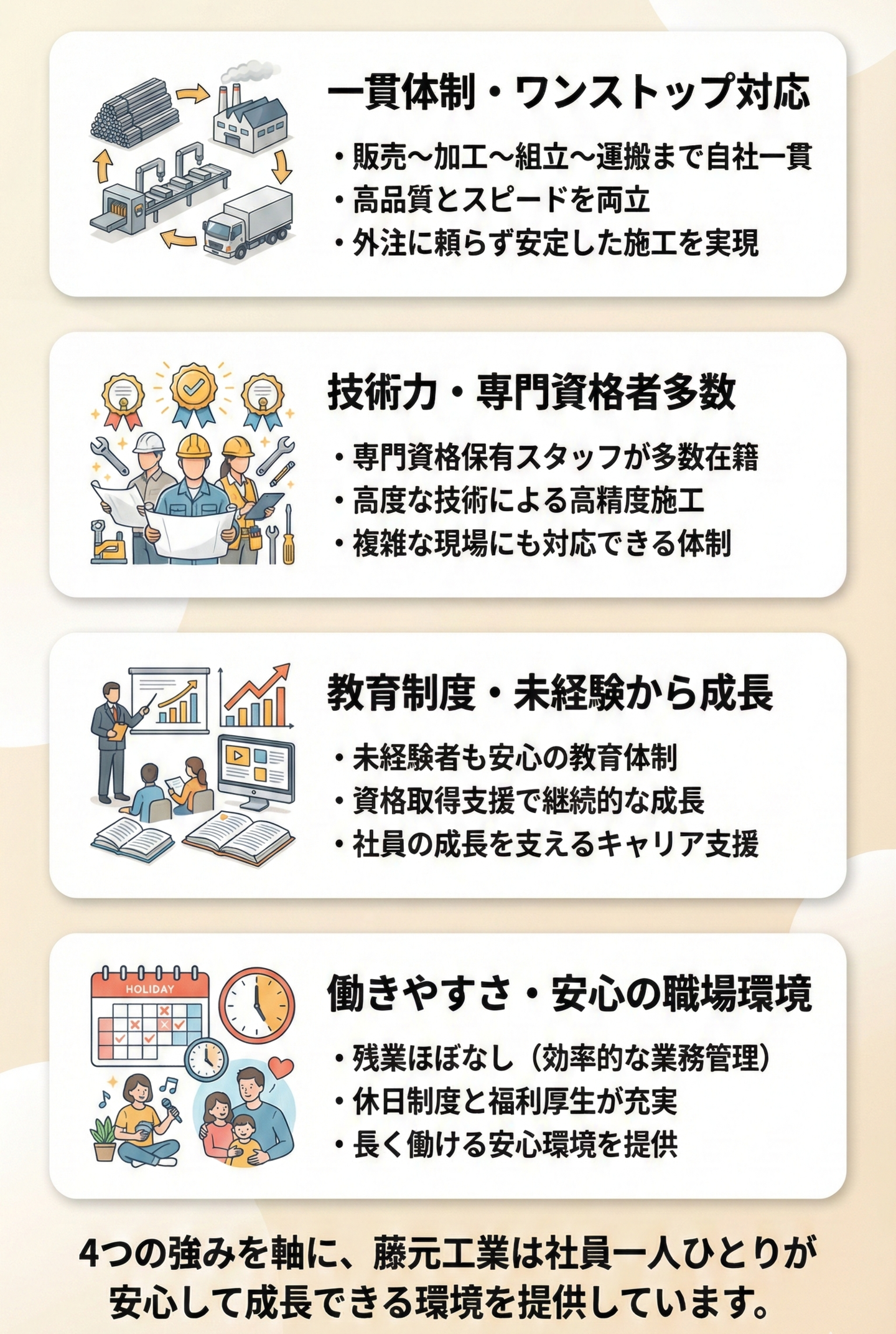 自社一貫体制による高品質施工、資格保有者による確かな技術、未経験から成長できる教育制度、そして安心して働ける環境を整え、長く活躍できる職場を提供しています。