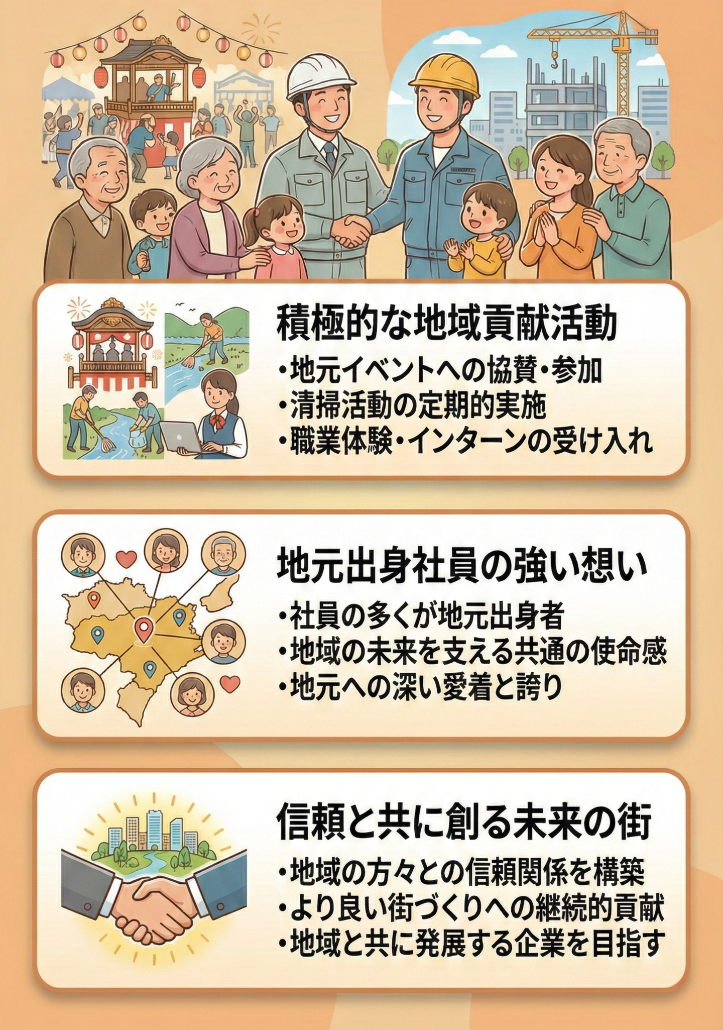 今後も、地域に根ざした企業として、地元の方々との信頼関係を築きながら、より良い街づくりに貢献してまいります。
